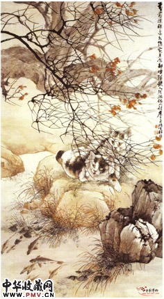 此图画池塘边两只花猫,匍匐在石块岸上,双眼紧盯着池塘中的游鱼。由于画家懂得生物百态,所以画石头、池边的水草、浮萍树干、树枝及红叶,在透视的处理上,远近、前后、浓淡、深浅等,都能合乎自然物象的真实。