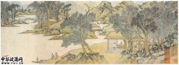 高木浓荫,掩映草堂,群山环抱,波抱蜒曲,帆樯林立,榭阁屋宇错落。近处草堂敞轩,二高士案前对坐,正在高谈阔论。在艺术表现手法上,用笔细腻严谨,山石仅用渴笔微抹,以点苔显出明暗,经营位置,得写生之助化出清幽境界。