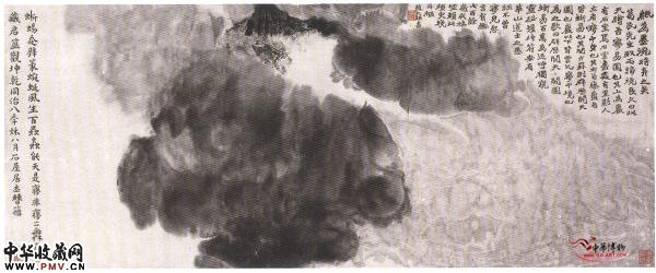 清末书画家赵之谦的“泼墨云雾图”,纸本,44×165厘米,藏西泠印社。 这件作品为“废物”利用而成,出于天成。“纸为墨涴,将弃之关。葛民先生取而谛视良久曰:‘此天绘吾梦易图也。其上为岩,有石室焉;石室尽处,有黑影人立者,梦中身也;其右若藤萝者,皆蜥易也……’” 赵之谦在画之右上角题跋记此画之原委,至于此画是否经修饰,跋中未提,就不可知了。 赵之谦(1829—1884),字益甫、撝叔,号无闷,悲盦。浙江绍兴人。精擅书画印诸艺,长于金石考证。