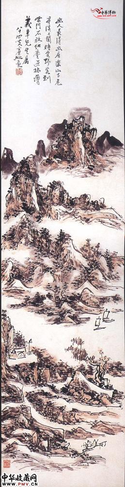 此轴为黄宾虹的“浅绛山水图”,设色纸本,纵125厘米,横31厘米,藏于西泠印社。 黄宾虹一生作画无数,面目也极多。此幅是黄宾虹84岁所作,构图疏简、空灵,线条圆润富有弹性和力度。略作皴擦,染以赭色,点以疏密有致的苔点,山川风貌跃然纸上。又复得山水华滋,境界幽深。 黄宾虹(1865-1955)初名懋质,应试改名质,字朴存,朴丞、朴岑、劈琴、予向、滨虹散人、虹若、虹叟、黄山山人,中年更号宾,歙县人。