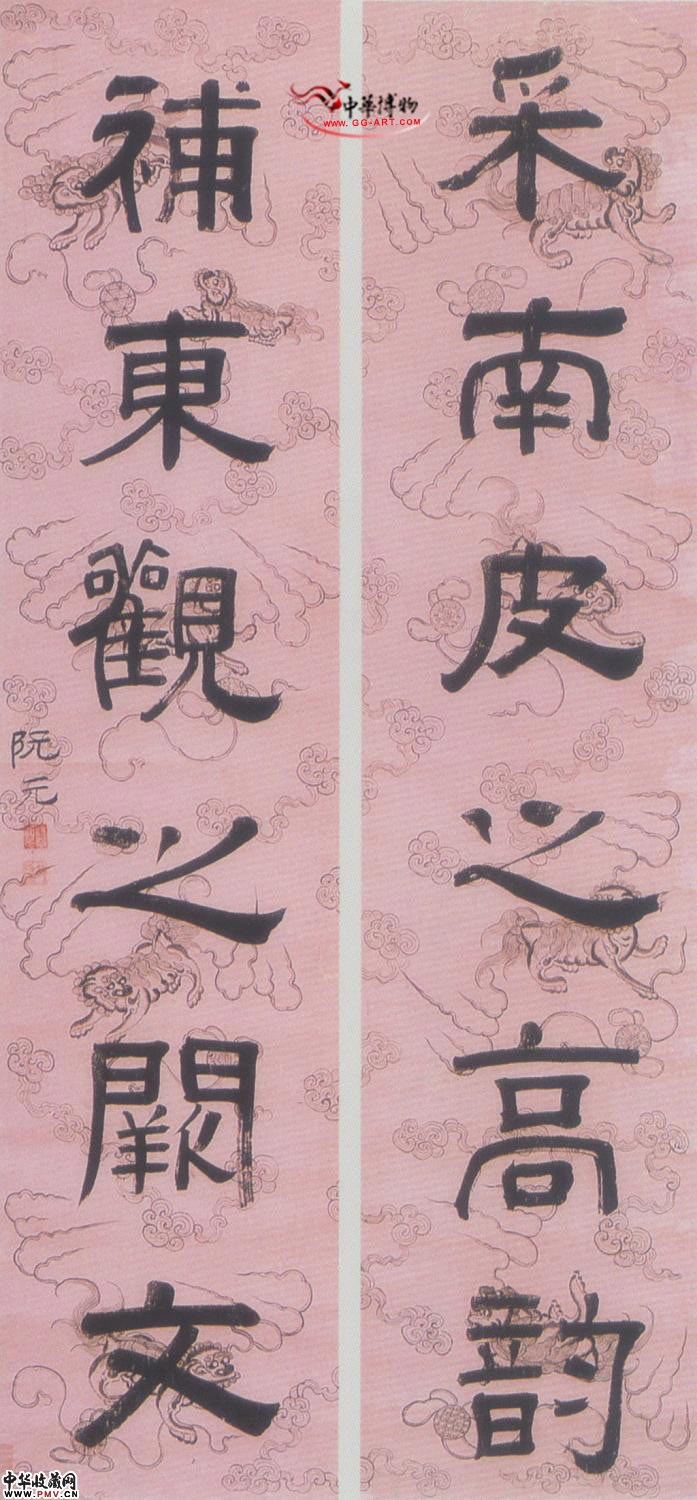 此为阮元的“隶书对联”。 笔力遒劲而又雅致的隶书六言联为阮元书作,书体拙朴大度,有金石碑版之趣,没有世俗之气。笔力遒劲而又雅致,富有韵味,是其隶书中的代表之作。 阮元(1764-1849),字伯元,号芸台,江苏扬州人。他的书体虽宗帖派,但因长期浸淫于金石碑版之间,亦能作隶书。通过对历代金石碑版的考察研究,他对书法史的发展脉络和风格演变提出了自己的观点,著有《南北书派论》和《北碑南帖论》两篇文章,从理论上倡导碑学,追随者甚众,影响深远。