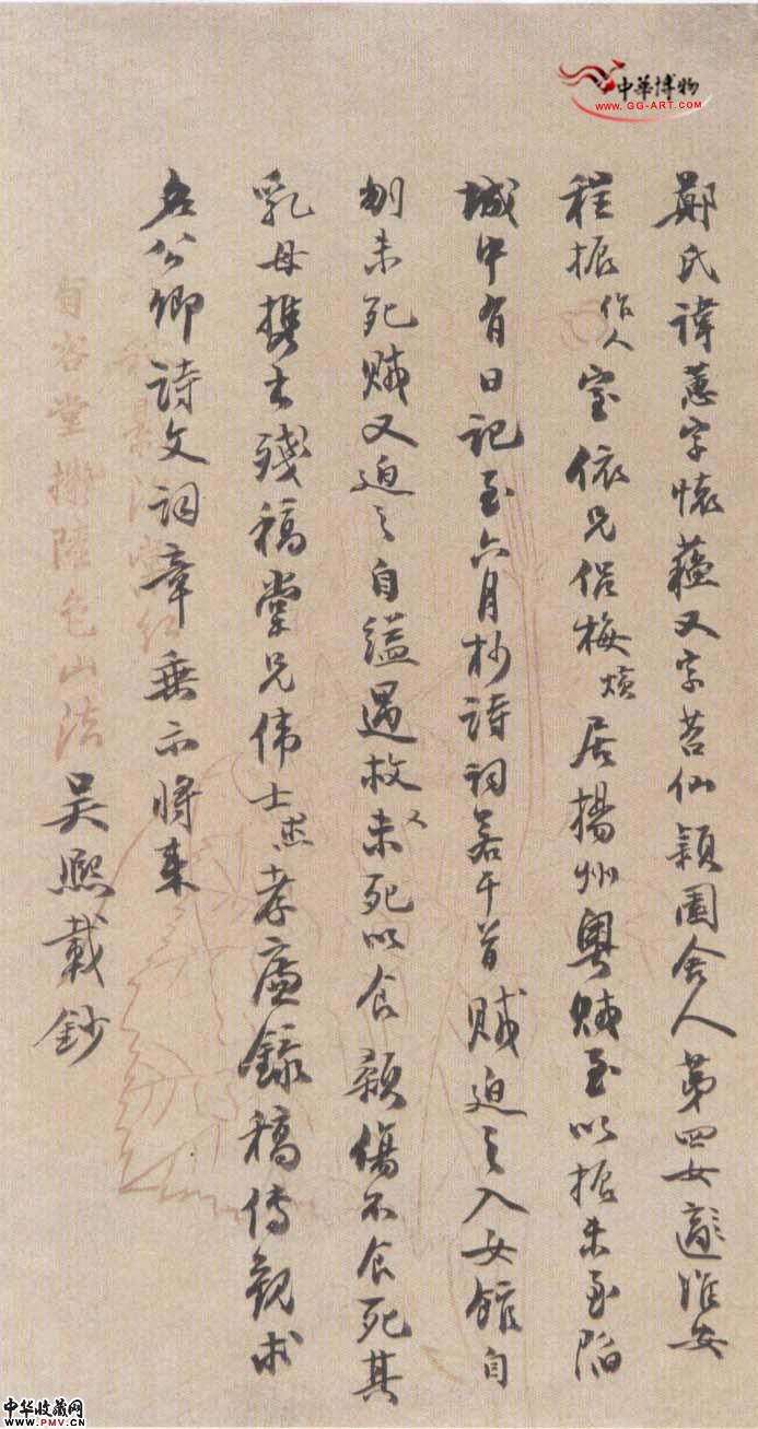 释文: 郑氏讳蕙,字怀苏,又字苕仙。颖园舍人第四女,淮安程振作人室。依兄侣梅熿居扬州,粤贼至,以振未至,陷城中。有日记至六月杪,诗词若干首。贼迫之入女馆,自刎未死。贼又迫之,自缢遇救,又未死。以食,颡伤,不食死。其乳母携出残稿,堂兄伟士杰孝廉录稿传观,求名公卿诗文词章垂示将来。 吴熙载钞