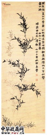 浓墨画双竹并峙,竹竿浓重挺拔,枝叶繁茂,用笔拙重,富于装饰风格。此画绘兰花修竹,画风简淡清丽。画上有画家自题:"雨后修篁分外青,潇洒如在过溪亭。世间都是无情物,只有秋声最好听。七十六叟杭郡金农。"