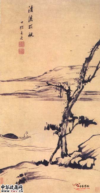此图以简率的笔墨,写出幽僻孤寂之意。自题:“清溪放艇。士标画意”。