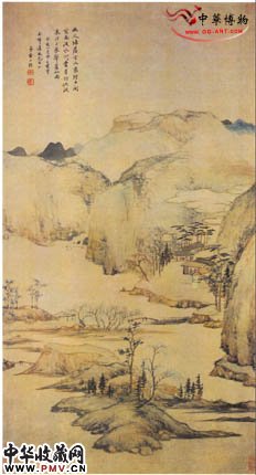画家用干笔皴擦,率意中不乏繁复;布局工整,树石刻画精微,淡设色极淡雅。此图画空旷山峰的起伏中,一屋舍悄立于中,意境清幽明净,风格诚如清代张庚所论。