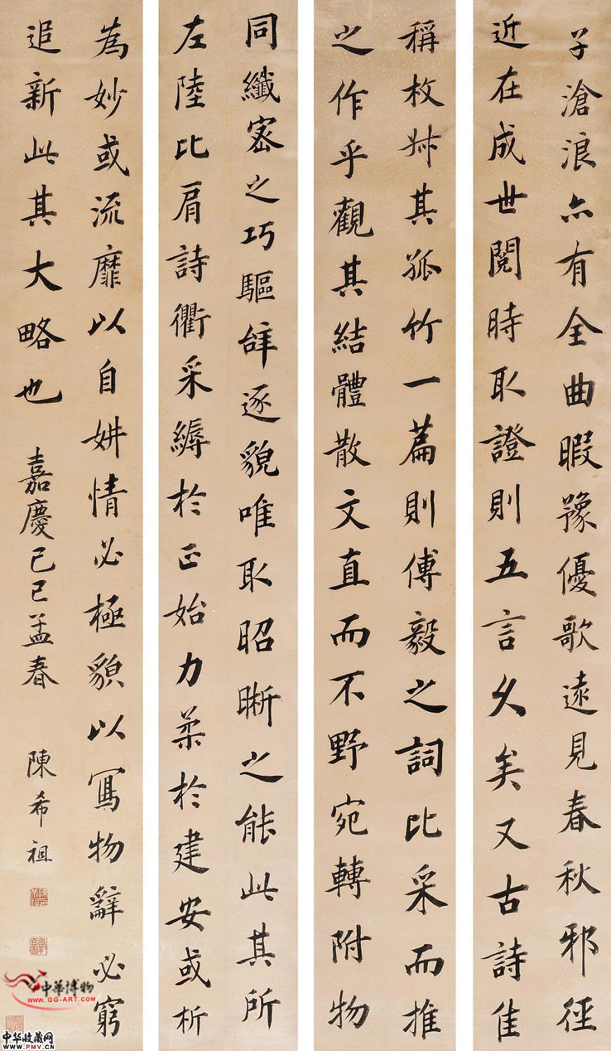 钤印:陈希祖印、敦一鉴藏印:张慈生鉴定书画真迹题识:嘉庆己巳孟春,陈希祖。 陈希祖,《艺林年鉴》作(1767-1820)江西新城(今江西黎川)人。乾隆五十五年进士,官御史。诗古文辞与一切星命方士庶杂学,无不究心,而书名独盛。