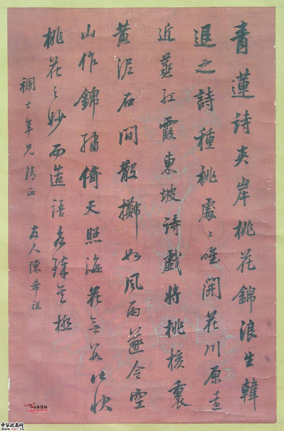 此幅作品绢本,旧裱立轴,横53.4厘米,纵82.8厘米。红地套色印清供杂宝纹,书名家诗联句“青莲诗夹岸桃花锦浪生。韩退之诗种桃处处唯开花,川原远近蒸红霞。东坡诗戏将桃核裹黄泥,石间散掷如风雨。遂令空山作锦锈,倚天照海花无数。”印两方。