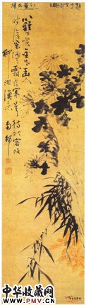 此《竹菊图》设色画菊花与红叶,构图别致,是对花写貌,绽开的花朵和欲放的蓓蕾,疏落有致,有水墨勾花点叶,很有笔墨功力。