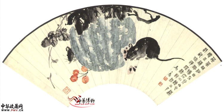 近现代马公愚 西瓜老鼠扇面