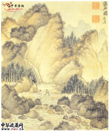 这一图册作山水、人物、花卉,画法工整,趣味古拙。其8开分别是:"1、山图2、黄河巨津3、湖山深远山水4、远浦归帆5、石泉云树6、罗汉、7、夔龙补衮图8、玉堂柱石。