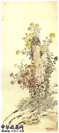 此图绘秀石挺立,五色菊花盛开四周。上钤"乾隆御鉴之宝"、"乾隆鉴赏"、"石渠宝笈"、"三希堂精鉴玺"、"宜子孙"、"宝蕴楼书画录"等收藏印章。