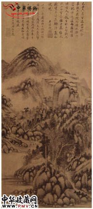 此图取全景式布局,远山以一尖顶缓坡的山峰为主体,其右下方以一平顶直壁孤峰相扶助,形成对比,简洁大方。中景作以密布的山石林木,数座房屋掩映其间。屋旁山泉急流从林中冲出。此幅画中山石勾出轮廓后以近景丛树勾点叶形外,其余基本以横竖点法写出大意,后树石均施以赫石、花青等色。其笔法文秀沉实,墨彩温雅清淡,体现出了董其昌所谓的南宋画的基本风格。