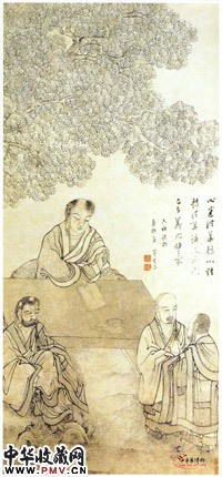 此图以白描手法画禅宗南宗创始人慧能诵经于菩提树下,前有三僧或坐或立,似在辨论经义。