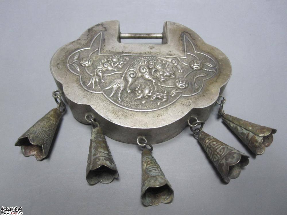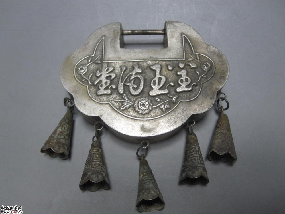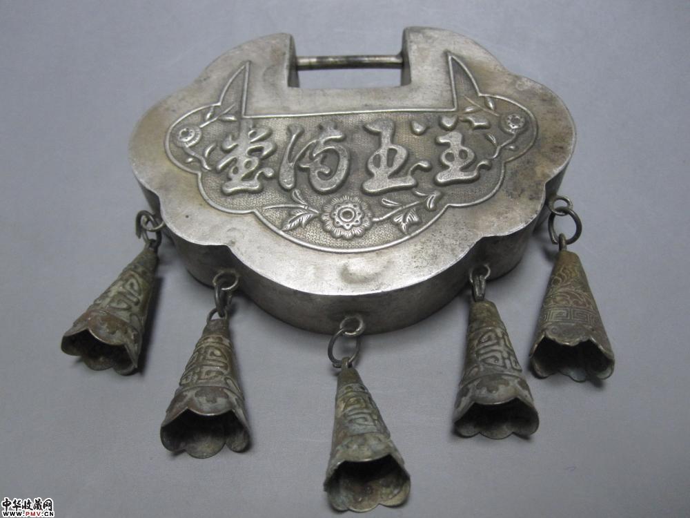 尺寸、锁长:6.2厘米,宽:8厘米,厚:1.8厘米。品相完好。五个铃铛。