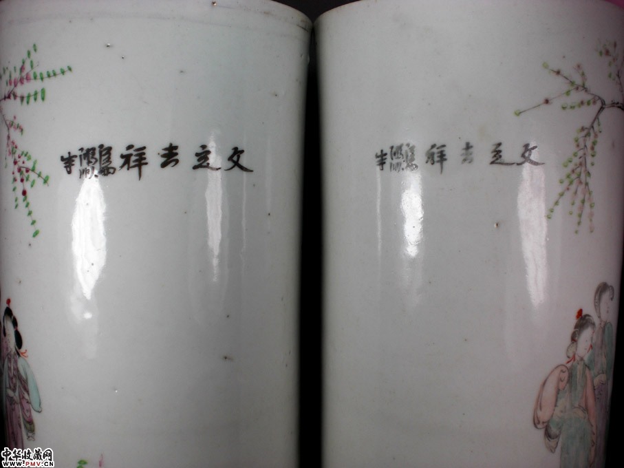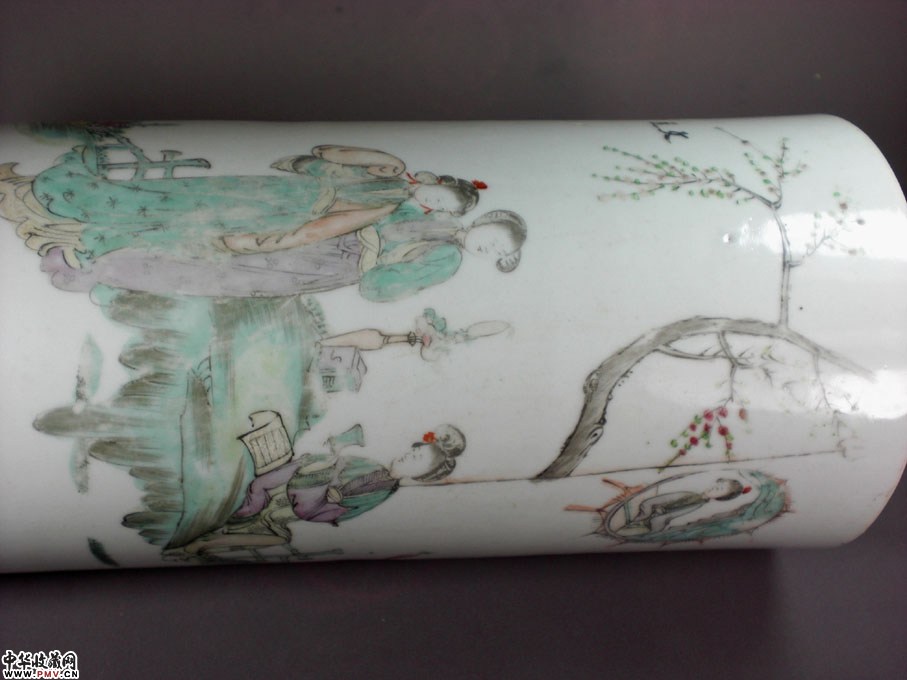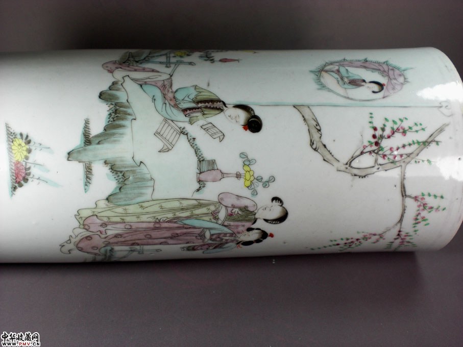 高28.5厘米,一只全品,另一只筒内两处惊釉未透。画工细腻,人物表情生动,反映出古代的大家闺秀久居深院,秉烛夜读,侍女相伴的一种封建礼制!这是一对非常开门的藏品,是一对很好的摆设!