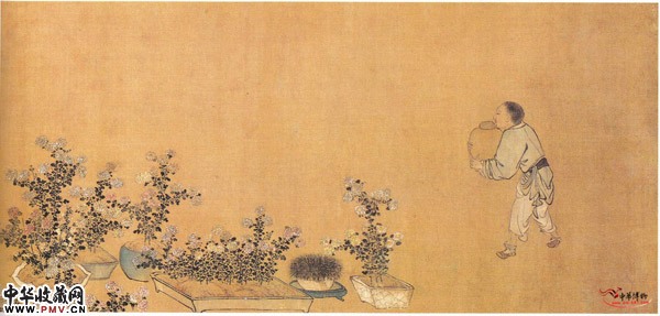 此画即是禹之鼎用白描手法绘制的清代大画家王原祁饮酒赏菊的肖像。画面除王原祁和盛开的菊花外,还有两位闲谈的童子。把酒赏菊,愉悦溢于言表的王原祁睿智爽朗的形象十分真切写实。