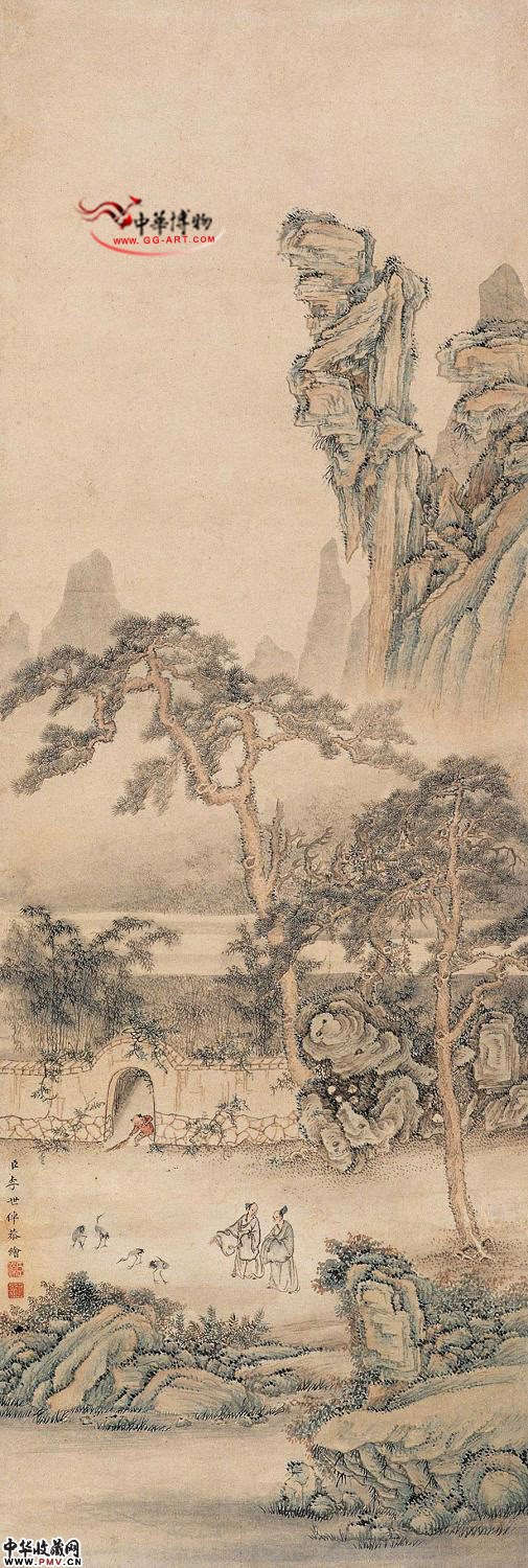 钤印:臣倬、恭绘题识:臣李世倬恭绘。 按语:李世倬是高其佩外甥,少尝闻王石谷讲论,因通画法,善山水、人物、花鸟、果品,或秀润严谨,略近四王法规;或恣肆率性,似得舅氏遗风。此帧是其精谨者,而境极奇险、韵极秀雅,虽不烦皴染,而无琐碎薄弱之病,是他作品中之极佳者。李氏官职不小,此落臣字款,或为进呈之作,亦可能为某王公所作,故精能如此。