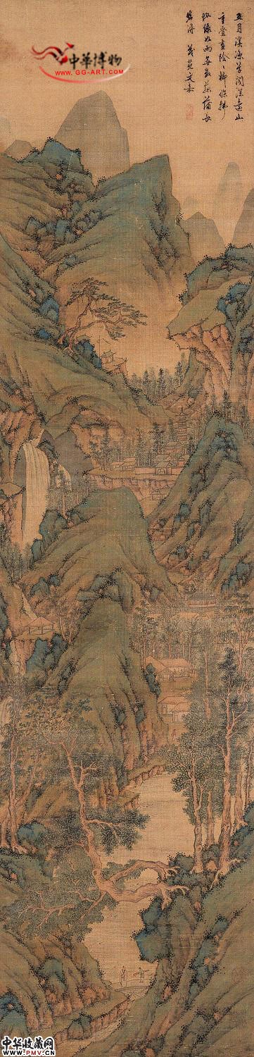 钤印:文嘉、停云、文水道人(1、3印参见《中国书画家印鉴款识·文嘉》35、49印,167、168页)题识:五月溪凉草阁深,远山重叠昼阴阴。柳条拂地绿如雨,无数菰蒲长碧浔。茂苑文嘉。 按语:在文徵明的儿子中,文嘉继承了父亲的忠厚,故画笔亦平实执着,虽乏灵变,但笔笔到位,极少荒率浮滑之态。此图重林叠嶂,清流映带,村舍罗列,曲径通幽。用笔与设色,都恪守父亲的遗法,确是他的真迹无疑。