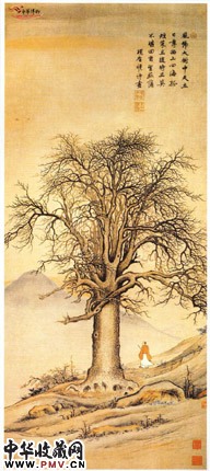 此画的主题是大树和老人,荆棘杂草丛生。画家用浓重的笔墨刻画大树,画中大树参天而立,主干粗壮挺直,有刚强不屈之势,枝条繁密横生,蟠曲虬劲,虽树叶尽脱,却显得气势非凡。全画构图别致,在视觉上故意营造一种既苍劲又独立不移的稳定感。本幅有画家自题:风号大树中天立,日薄西山四海孤。短策且随时旦莫,不堪回首望菰蒲,项圣谟诗画。