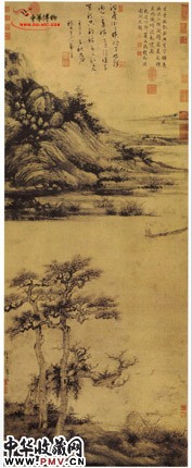此图画嘉兴东洞庭的湖山景色,秋峦葱郁、长松劲拔,渔舟细小如叶在水面飘浮,构图用阔远的二段式,突出了江南山重水复的自然之美,内容亦为画家长年活动的湖泽沙渚,黄芦短荻。山石作披麻皴,再加湿笔浓墨点苔,充分发挥了水墨氤氲的特征,抒发了幽闲澹远的情致,自识:"梅花道人戏墨","嘉兴吴镇仲圭书画记"白方印。幅上又自题词:"洞庭湖上晚风生,风搅湖心一叶横。兰棹稳,草花新,只钓鲈鱼不钓石。至正元年秋九月,梅花道人并书。"
