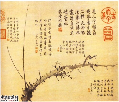 吴镇性爱梅花,在家四周遍栽梅花,其所亦命名曰"梅花庵"。此图画法简单中透着灵气和飘逸,虽只画梅一枝,竹叶几片,却丝毫不影响整个画面的整体感和生机昂然。笔意简洁率稚,梅花一笔画出,顿挫转折,花开数朵,新条一挥到顶,与老枝成鲜明的对比,虽为游戏笔墨,却能见出画家的深厚功底和苍劲坚挺的笔力。