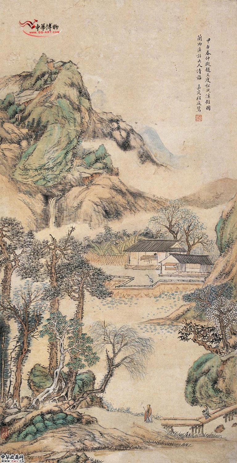钤印:庭鹭之印题识:甲午春仲拟赵文度松风溪馆图。兰卿廉访大人清诲。嘉定程庭鹭。 程庭鹭,清代画家,初名振鹭,字暾真,又字问初,号绿卿,改名庭鹭,字序伯,号蘅乡。号红蘅生、因香庵主、忘牧学人、怀子、鹤钏山民等。晚又号(庵)。嘉定(今属上海)诸生。工词章,兼擅丹青、篆刻。