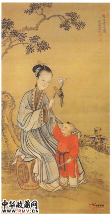 这是一幅寓意画,以桂树、妇人手中的莲花、芦笙以及膝下的幼儿,组成"连生贵子"的吉祥含义。此图为工笔重彩画,线条挺拔有力,颇见功夫,色彩也很鲜艳明快,但是同时又受到欧洲画风的影响,造型准确。