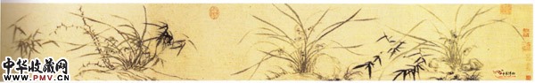 此图描绘的是坡上兰草一丛,设色清雅,根丛的杂草、坡土,或勾、或撇、或拖,随意涂抹,湖石亦以粗笔勾、研、皴、染,时见飞白,最显放逸,淡墨画出坡地,大面积的留出空白背景,更添兰花的高洁气质。此作在画法上极似文徵明,看来画家跟随文徵明学习后深得文氏画法要决。