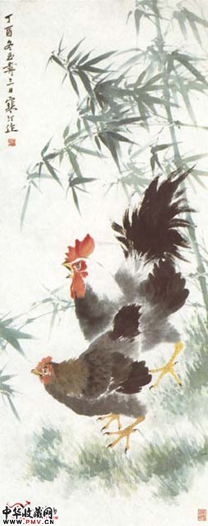 近现代江寒汀 绿竹双鸡