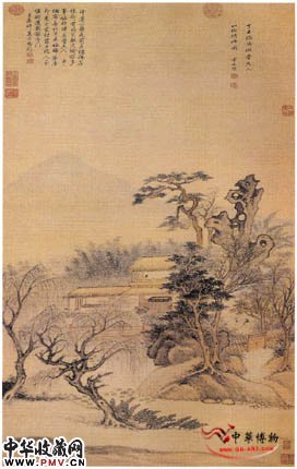 此图描绘江南源庄景色。在重檐的山楼中,陈设精洁雅致,一妇人正临窗刺锈。楼后竹林茂密莹碧,高耸透瘦的湖石与乔松、芭蕉矗立一侧。远山如黛,轻岚浮动。画家以松疏的笔触在有限的尺幅间表现了如此繁复的构图与内容,而在细微处亦一丝不苟,其笔法严谨秀雅。墨色于浓淡变化与映带上更讲求合谐统一,匠心独具,显示出画家深厚的传统功力。