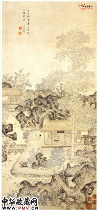 此画描绘一屋轩及其周围的景色。画中有一座草堂,前有梧桐一株,高高矗立。梧桐树叶勾染精细,枝叶穿插自然得体,勃勃而有生机。屋外一只仙鹤似乎在闻声起舞,院落之中鲜花盛开;草堂四周,湖石环绕,皴法细密,苍劲润泽;左边小桥流水,水上荷萍点点,散落有致,整幅作品在花木的表现技法上多用双勾法,敷色清淡。