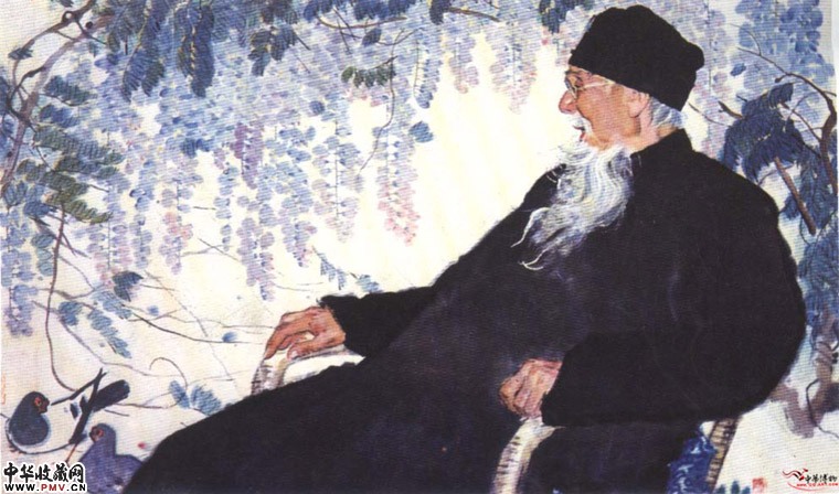 这件“齐白石像”(70×116厘米)即是一件非常成功的作品,背景紫藤、鸽子是齐白石笔下表现的作品,白石老人坐于紫藤花阴下观察着鸽子的形神,右手似乎在比划着,已成竹在胸。人物帽子、衣服用大块重色表现,十分凝重,衬托了白石老人的银须,老人神情安详。白须不用传统留白表现,而是以白色颜料来画,胡须质感很强。在传统的基础上揉和外来绘画的优点,是近现代以来中国画家的可贵探索。