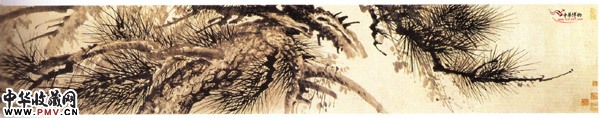 鳞纹斑剥的松干、俯仰交叉的松枝,锋芒四射的松针,用粗细、刚柔、浓淡不同的笔墨,既真实刻画出松树的形态和质感,又充满劲健飞动的力感。