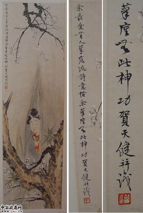 此图以诗意写梅花美人,构图新颖,设色雅致,虽贺氏自谦“笔底无此神功”,亦不失为其中年佳作也。
