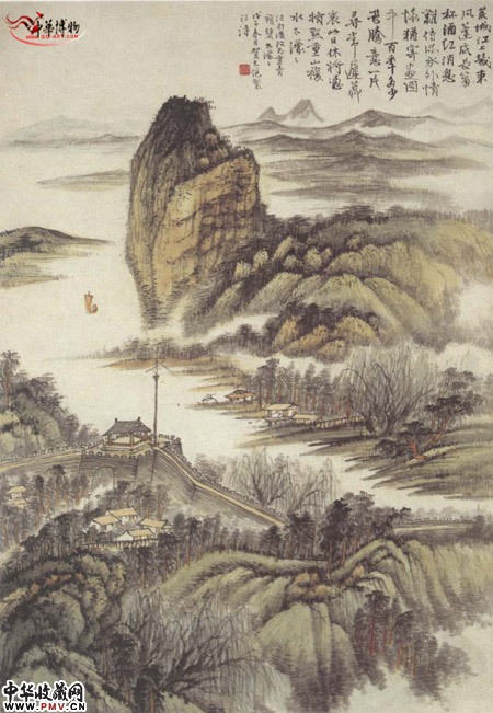 贺天健 庚午(1930年)云外寺楼图 轴 纸本设色
