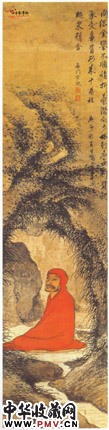 此画描绘菩提达摩面壁打坐,苦行修炼的情形。达摩面部的刻划,坚韧虔诚。据南朝梁释慧皎《高僧传》谓,达摩,天竺人,本名菩提多罗。于梁普通元年入华,武帝迎至金陵。后渡江往魏,止嵩山少林寺面壁九年,传法于慧可。达摩为中国佛教禅宗的始祖。画中自题七绝诗一首,年款为庚子。《明画录》载其“游寓多居精舍,禅灯孤塌,世以发僧高之。”这幅作品署有“超泉精舍”。现其笔墨简炼沉着,应当是晚年八十六时所作。