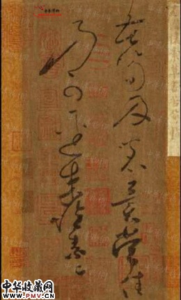 “苦笋帖”正文二行十四字,绢本,纵25.1厘米,横12厘米。此帖曾入宋内府,有“宣和”、“绍兴”印记,帖后有米友仁、项元汴等人题跋。