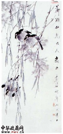 画面杨柳垂吊,竹影绰约。两只八哥栖上枝头,一只似发现可食之物展翅俯冲向下飞去。柳条上叶子稀疏,呈半枯状,显然已是夏去秋来之时节。淡墨飞白笔画柳枝、叶,线条时有顿挫,给人以飘洒柔韧之感。竹叶用湿笔淡墨虚远模糊,于前景形成鲜明对照。笔直简达娴熟,是虚谷的晚年佳作。款署:"蘅珊仁兄大人教正,虚谷时年七十有二。"