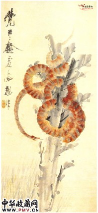 画上画家自识"觉非虚谷戏作",钤"三十七峰草堂"朱文椭圆印。此图绘深草间一条纹彩斑斓的赤练蛇,蛇身盘踞在老树枝叶间,虬结扭曲,形态怪异,蛇头下探,长信频吐,双目炯炯,似在回首威吓近敌。用笔肆纵,设色对比强烈,更映衬出蛇的狰狞恐怖。虚谷喜作赤练蛇,在画史上是罕有先例的。这题材多见于他早年的作品中,显示了他"性癖又好奇,书画破常规"的独特艺术性格。