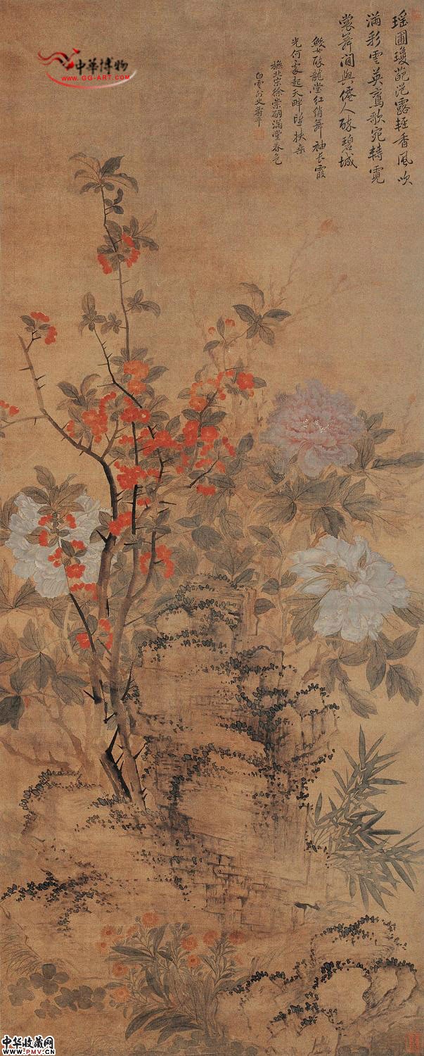 款识:鲛女醉龙堂,红绡舞袖长。霞光何处起,天畔望扶桑。抚北宋徐崇嗣满堂春色。白云外史寿平。