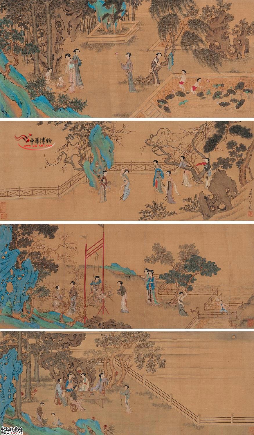 钤印:仇英之印、实父(二次) 鉴藏印:吴珏质珍藏章、悟言室印、玉磬山房(二次)、征中、衡山题识:吴郡仇英实父制。 后纸:周天球等四人题跋。说明:此件以四段画幅裱为一卷。