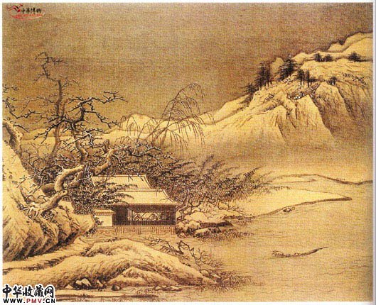 此画设色画江南雪景,笔法苍劲浑厚,山石多用小斧劈皴和线条丢笔直皴,从而取得了方硬奇峭、水墨苍润的艺术效果。夏圭在画树干、树叶时多用笔随意点画,笔法生动活泼,人物、楼阁已不像马远那样工整细密,而是信手勾画。全图设色淡雅,构图迂迥曲折,疏密远近布置得当,为夏圭山水画的代表之作。