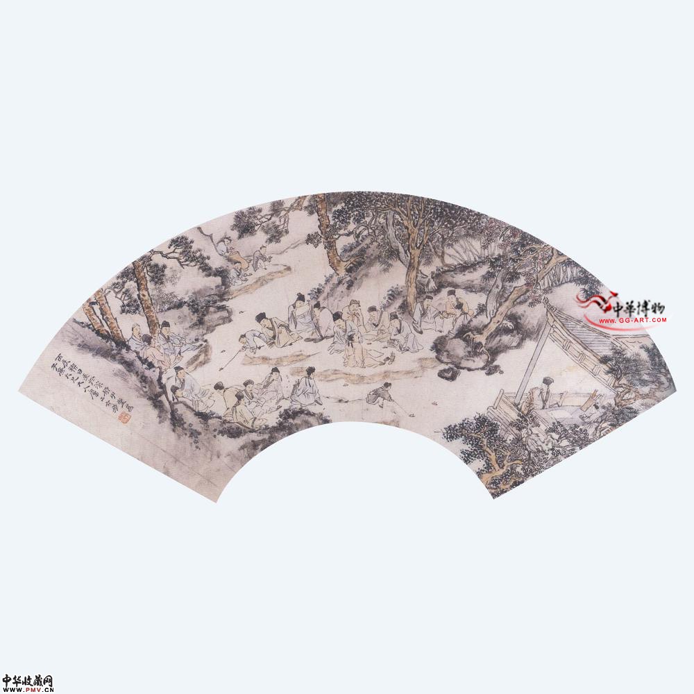 此为王学浩的《兰亭修禊图》,扇面,广东省博物馆藏。 此扇面描绘晋朝王羲之等人在兰亭溪上修禊、作诗、相会的故事。画面兼工带写,勾画出曲水弯弯,兰亭一角,树木丛生。山峦皴擦简练,临流水而坐的文人衣纹概括,取法宋元,画法工细,但不刻板。人物画是苏六朋所擅长的题材之一,所以写绘之时颇为顺手,运笔流畅。此件作品与文徵明所作同题《兰亭修禊图》扇面在构图上呈左右对称,人物布局基本相同,笔者疑此件作品是苏在过目文徵明同题画之后所作。