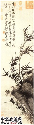 此图绘迎风摇曳的写意墨竹和泼墨山石,显得简率天真,逸气四溢,与画面画家的竹书题款相得益彰,体现了中国古代花鸟画的形式美感和笔墨情趣。