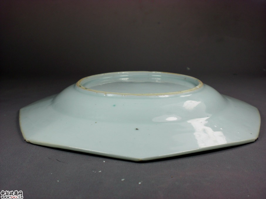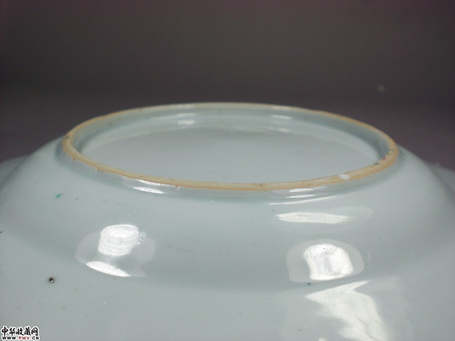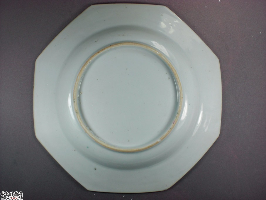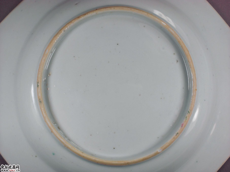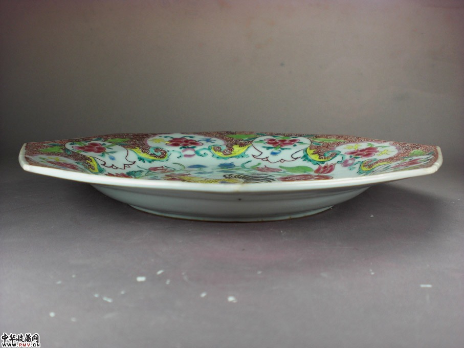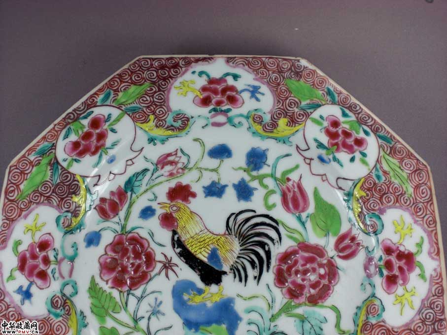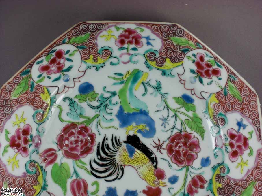 对角直径18.5厘米,主题绘画“公鸡”寓意“大吉”和“牡丹”寓意“富贵”,盘一周绘画“石榴”寓意“多子”,粉彩发色艳丽,盘边缘几处小爆釉外完好!