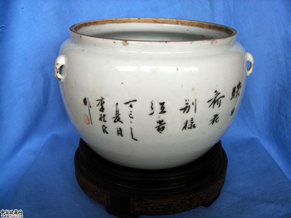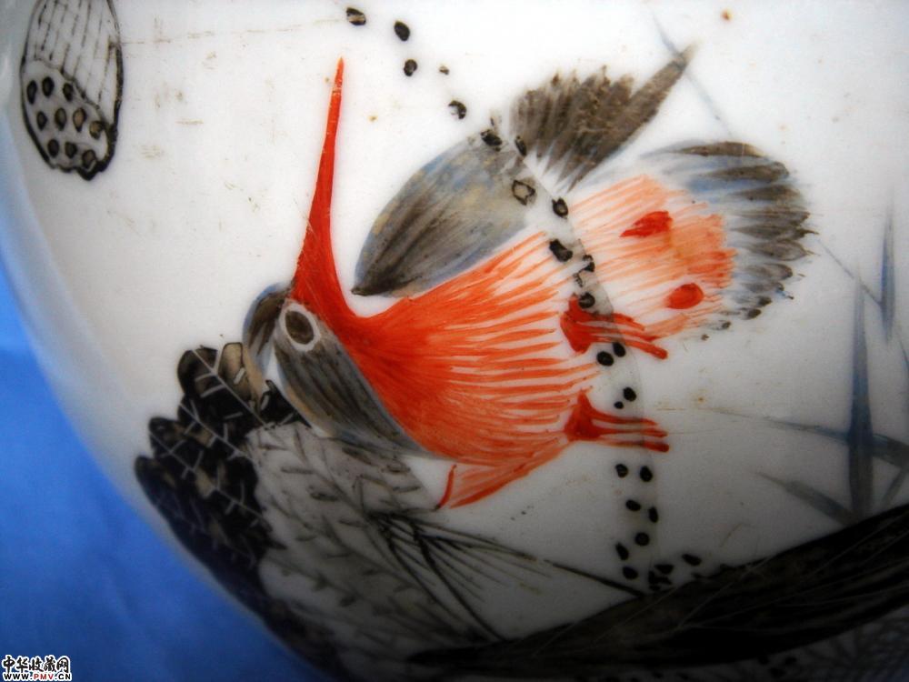 民国 1917年 翠鸟墨荷图 墨彩粥罐