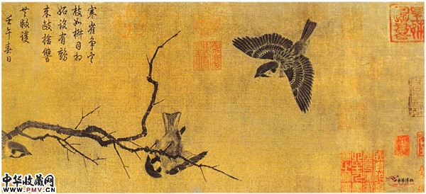 《寒雀图》描绘隆冬的黄昏,一群麻雀在古木上安栖入寐的景象。环境的描写被完全省略了,只剩下一株枝干虬劲的老树。用皴擦勾勒的古树的树干在形骨轻秀的鸟雀衬托下,显得格外浑穆恬淡,苍寒野逸。此画用色其淡若无,用笔灵活松动,运墨干湿浓淡相参,单纯中蕴涵变化,真可谓"体制清淡,作用疏通。"