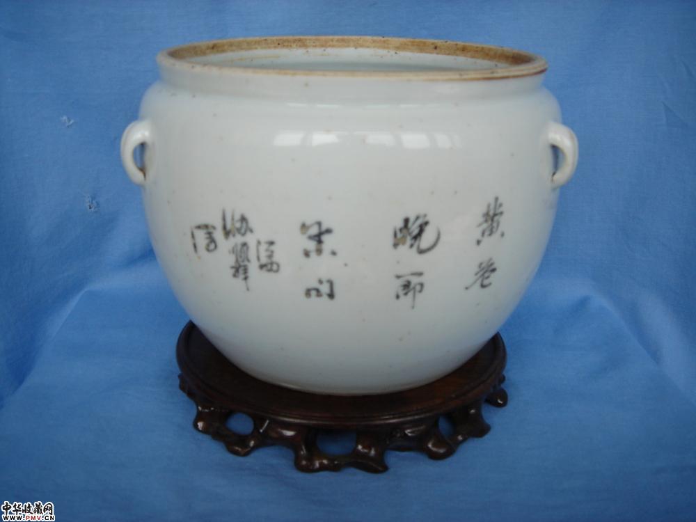 民国 菊花粉彩粥罐 [黄花晚节香句 江西源顺祥写]