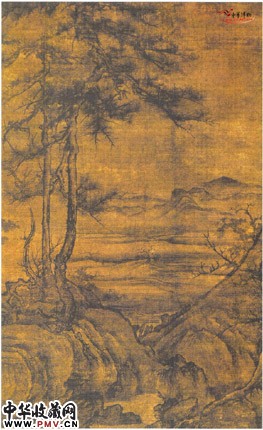绘冬日寒冽窠石坡陀上挺然生长着的长松老树,背后映衬平川远山,坡石壮如云头,送针细利,笔墨清润,树根部隐然可见李成款识,识者以为系后世添写,但本图鲜明地显示李成画风本色,处于宋元李郭画派中之高手当无疑议,画上钤有"怡亲王宝"、"明善堂览书画印记"、"淮阴鲍氏所藏"等印。