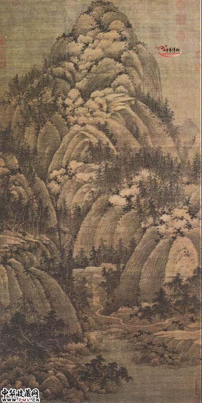 本图无款,以立幅构图画重重叠起的山峦,下部清澈的溪水,曲折的小路通向山中,山坳处茅舍数间。屋中有二人对坐,境界清幽,前人谓巨然之山水,善为烟岚气象,"于峰峦岭窦之外,至林麓之间,犹作卵石、松柏、疏筠、蔓草之类,相与映发,而幽溪细路,屈曲萦带,竹篱茅舍,断桥危栈,真若山间景趣也。"